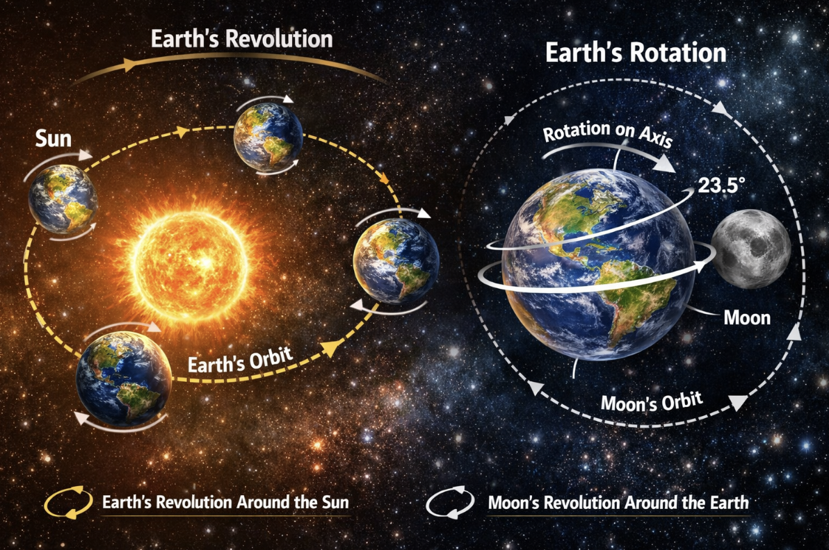또한 지구의 자전은 지구 자전축을 중심으로 한 바퀴 회전하는 운동으로 팽이가 제자리에서 도는 것과 같고 이로 인해 낮과 밤이 생긴다. 그리고 지구의 공전은 태양의 황도(지구가 도는 궤도)를 따라 도는 것으로 회전 목마가 중앙을 중심으로 해서 도는 것을 연상하면 되는데 이로 인해 계절의 변화와 시간 개념 변화(시차 등)가 생긴다.